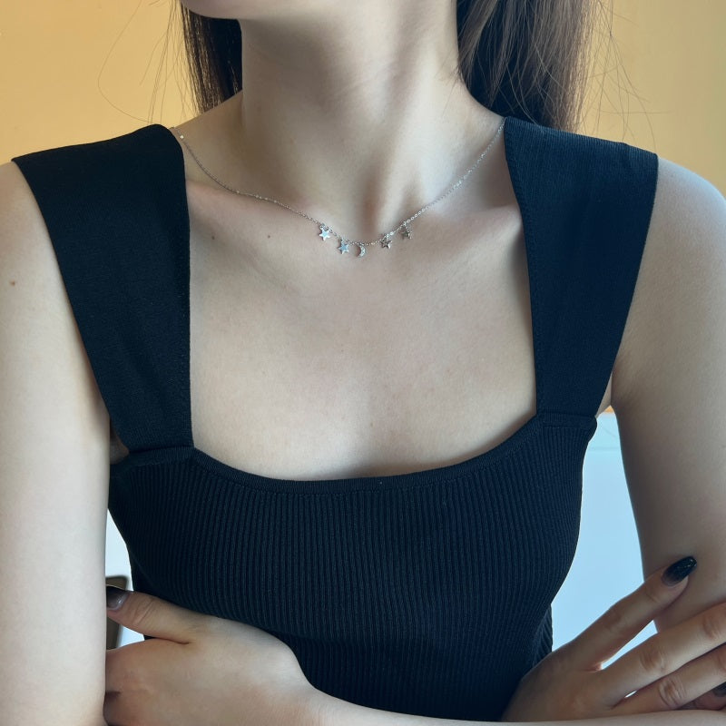 Colierul Argint Moon and Star cu codul de identificare L59 este realizat din Argint cu pietre de Zircon, testat si marcat in conformitate cu cerintele actuale ANPC. Colierul este placatcu 3 straturi de Rodiu pentru a da un plus de stralucire si rezistenta.