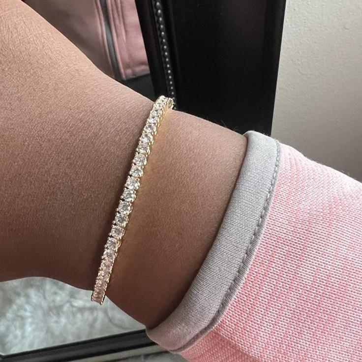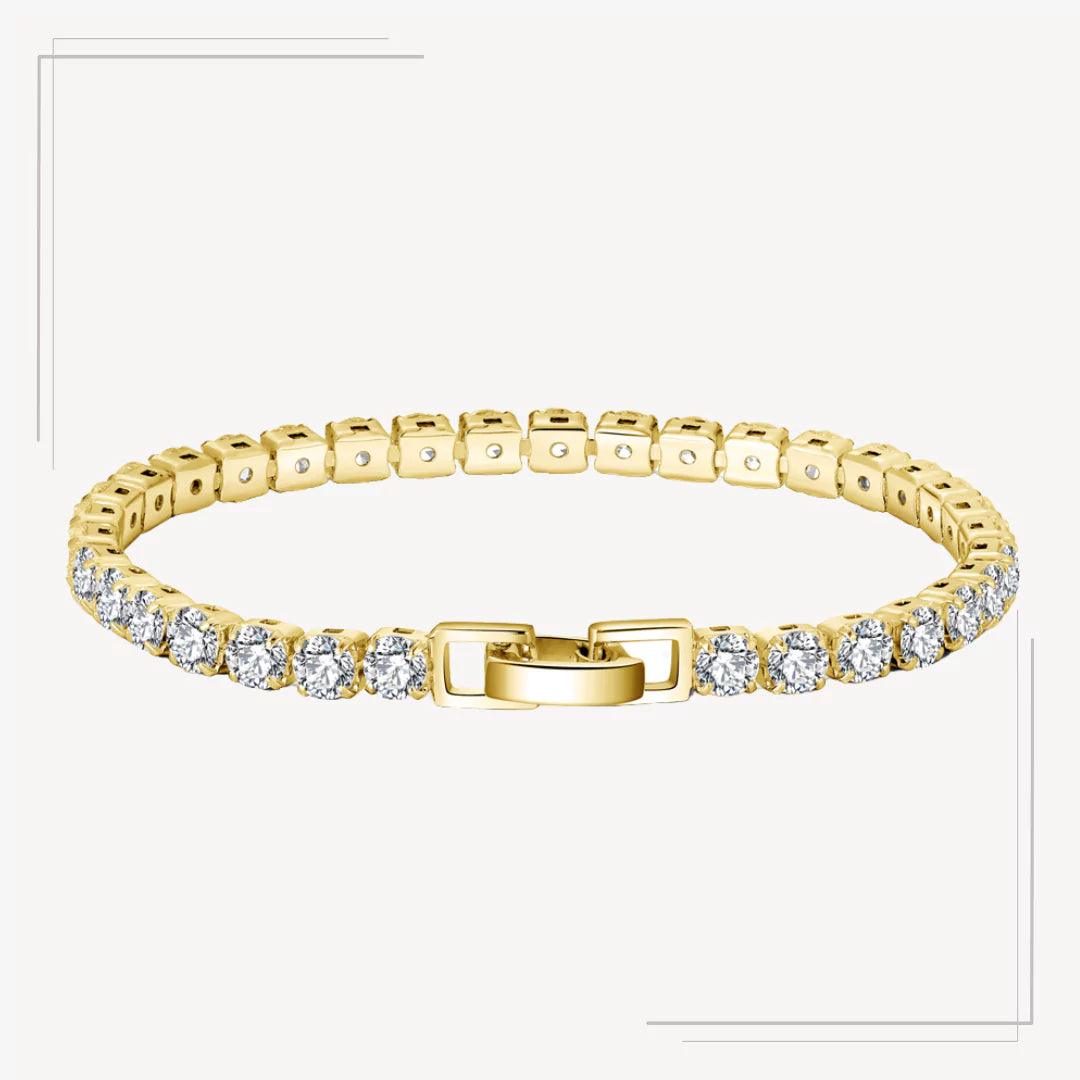 Brățara din argint Golden Tennis B75 îmbină farmecul clasic al designului Tennis cu accente moderne aurii. Zirconii de 4 mm, atent montați, oferă o strălucire caldă și rafinată, ideală pentru femeia care apreciază eleganța subtilă.